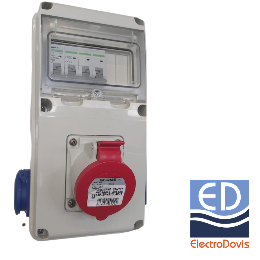 Tabloul este echipat cu 2 prize schuko,o priza 5P 16A si un intrerupator automat tetrapolar 16A.