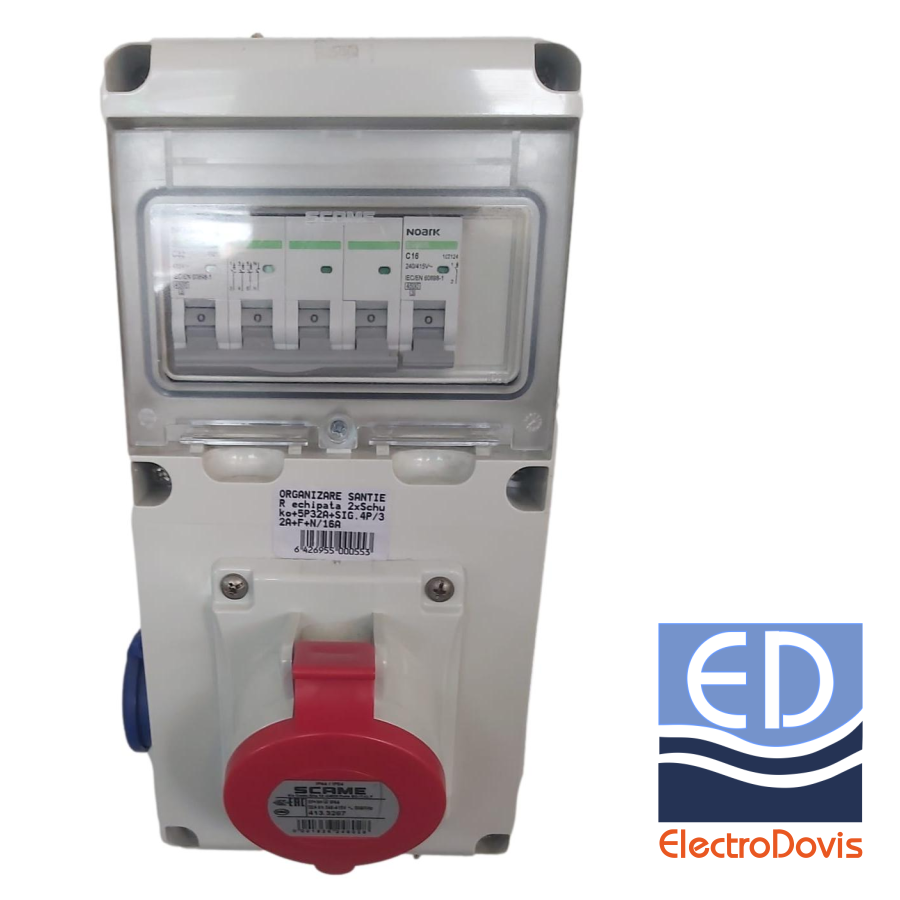 Tabloul este echipat cu 2 prize schuko,o priza 5P 32A, un intrerupator automat tetrapolar 32A si un intrerupator automat F+N 16A.
